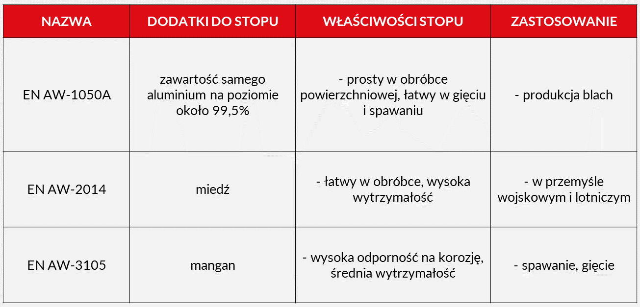 Jednym z podstawowych podziałów typów aluminium jest ten na jego stopy odlewnicze oraz do obróbki plastycznej. Skład oraz właściwości tych pierwszych precyzuje norma PN-EN 1706:2011 Aluminium i stopy aluminium – Odlewy -Skład chemiczny i własności mechaniczne, z kolei do stopów plastycznych odnosi się norma PN-EN 573-3:2014-02 Aluminium i stopy aluminium – Skład chemiczny i rodzaje wyrobów przerobionych plastycznie – Część 3: Skład chemiczny i rodzaje wyrobów. Przykładowe rodzaje stopów aluminium prezentuje poniższa tabela:
