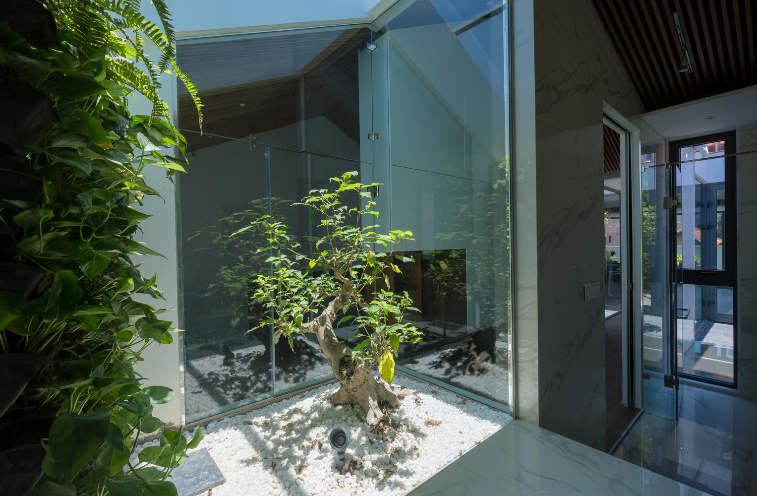 Intrygującym rozwiązaniem zastosowanym w projekcie jest niewielkie drzewko przypominające bonsai, znajdujące się w osobnym, przeszklonym pomieszczeniu w centrum apartamentu. Ten rodzaj roślinności, w połączeniu z bielą, drewnem oraz szkłem, tworzy współczesną, harmonijną przestrzeń, w której panuje jednocześnie przytulny i kameralny nastrój. Uwagę przykuwa także niewielka łazienka, której optycznej lekkości oraz przestronności dodało zastosowanie dużych, połyskujących kafli oraz szklanych paneli. Kabina prysznicowa wykonana została z pomocą relingów stabilizujących konstrukcję, niewielkich profili montażowych, a także klamer oraz zawiasów.