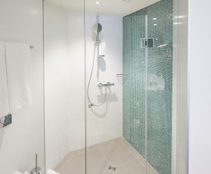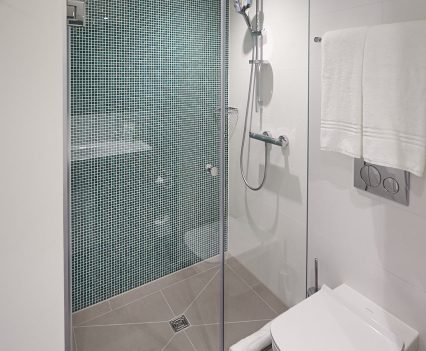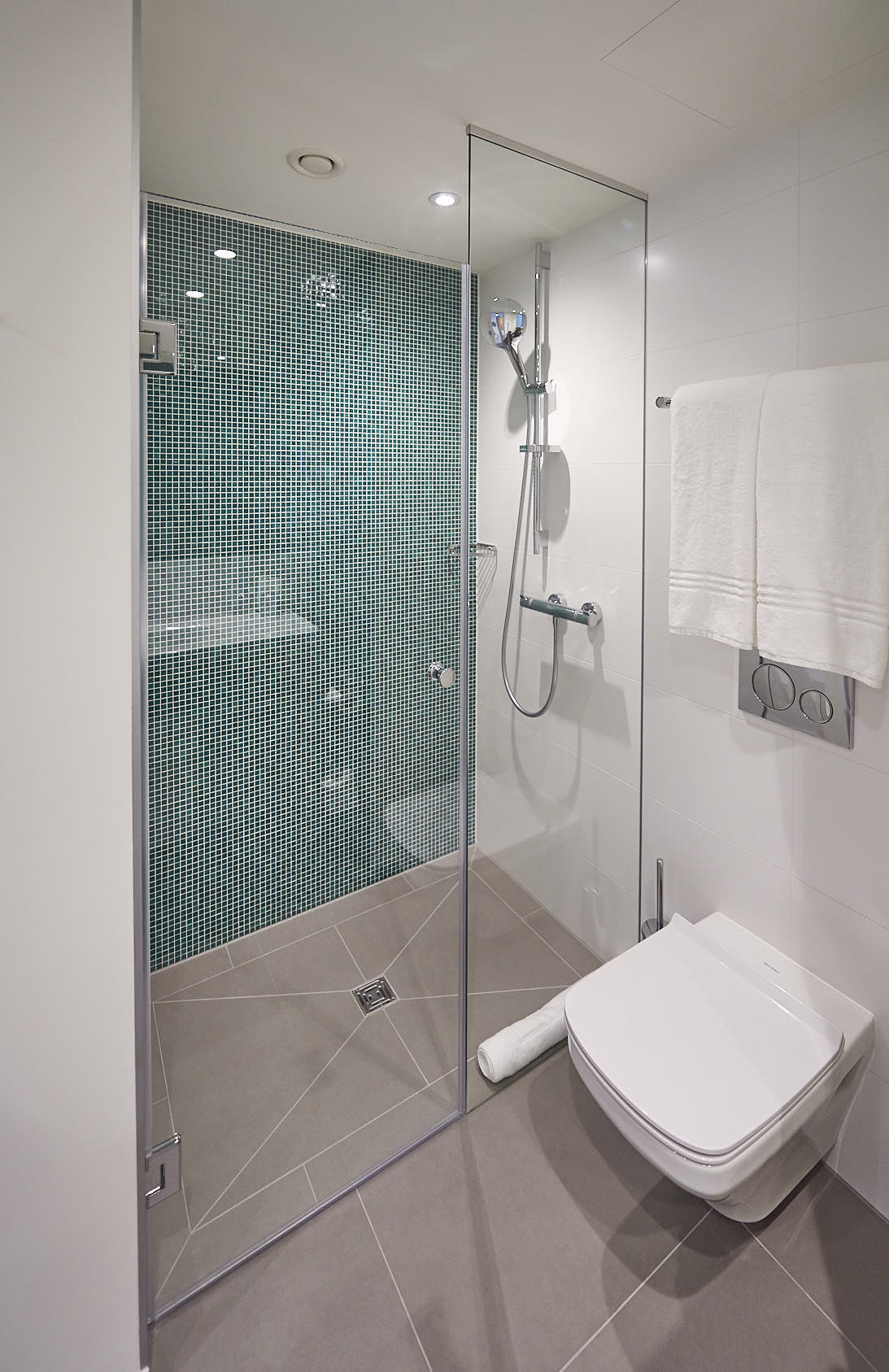 Wszystkie hotelowe łazienki urządzone zostały z wykorzystaniem jasnych odcieni, w tym przede wszystkim bieli oraz delikatnych szarości, które przełamuje mozaika z turkusowych kafelków. Zastosowanie na podłodze dużych, gładkich płytek pomogło optycznie powiększyć pomieszczenia, z kolei jasne fugi nawiązują do barwy ścian.