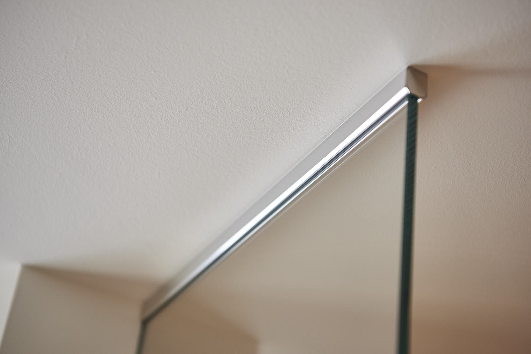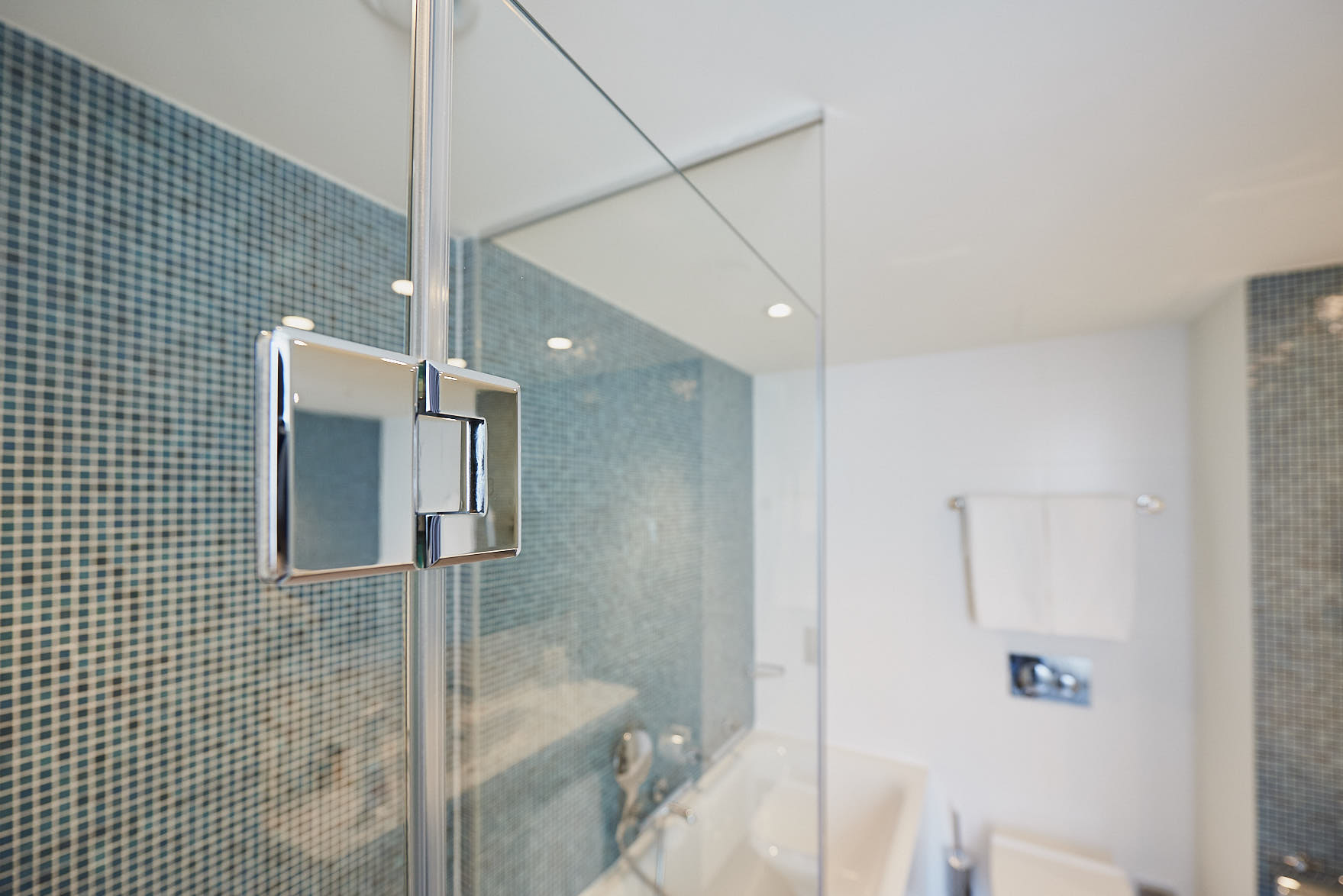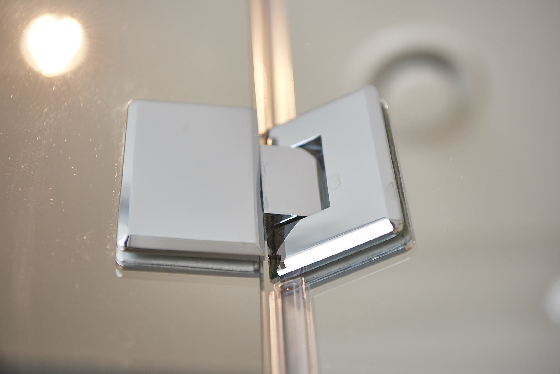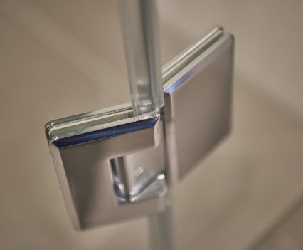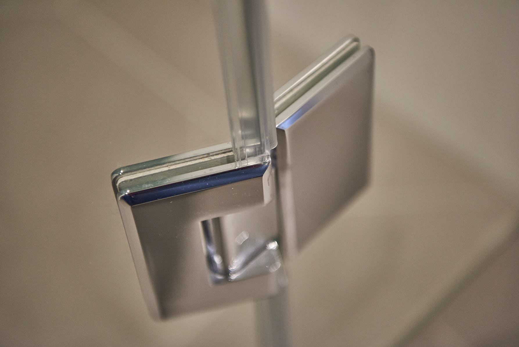 W zależności od wielkości oraz układu konkretnego pomieszczenia, w łazienkach zamontowane zostały kabiny wnękowe lub narożne. Niezależnie jednak od ich wariantu, szklane panele stałe zamocowano w subtelnych, niskich profilach typu Fix z serii Lazio, z kolei do montażu szklanych drzwi wykorzystano zawiasy z kolekcji Bologna. Wszystkie zastosowane w realizacji okucia mają połyskujące wykończenie, które doskonale komponuje się z prostym, nowoczesnym wnętrzem. Eleganckim dodatkiem do szklanych drzwi kabiny są subtelne gałki z serii Modena.