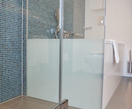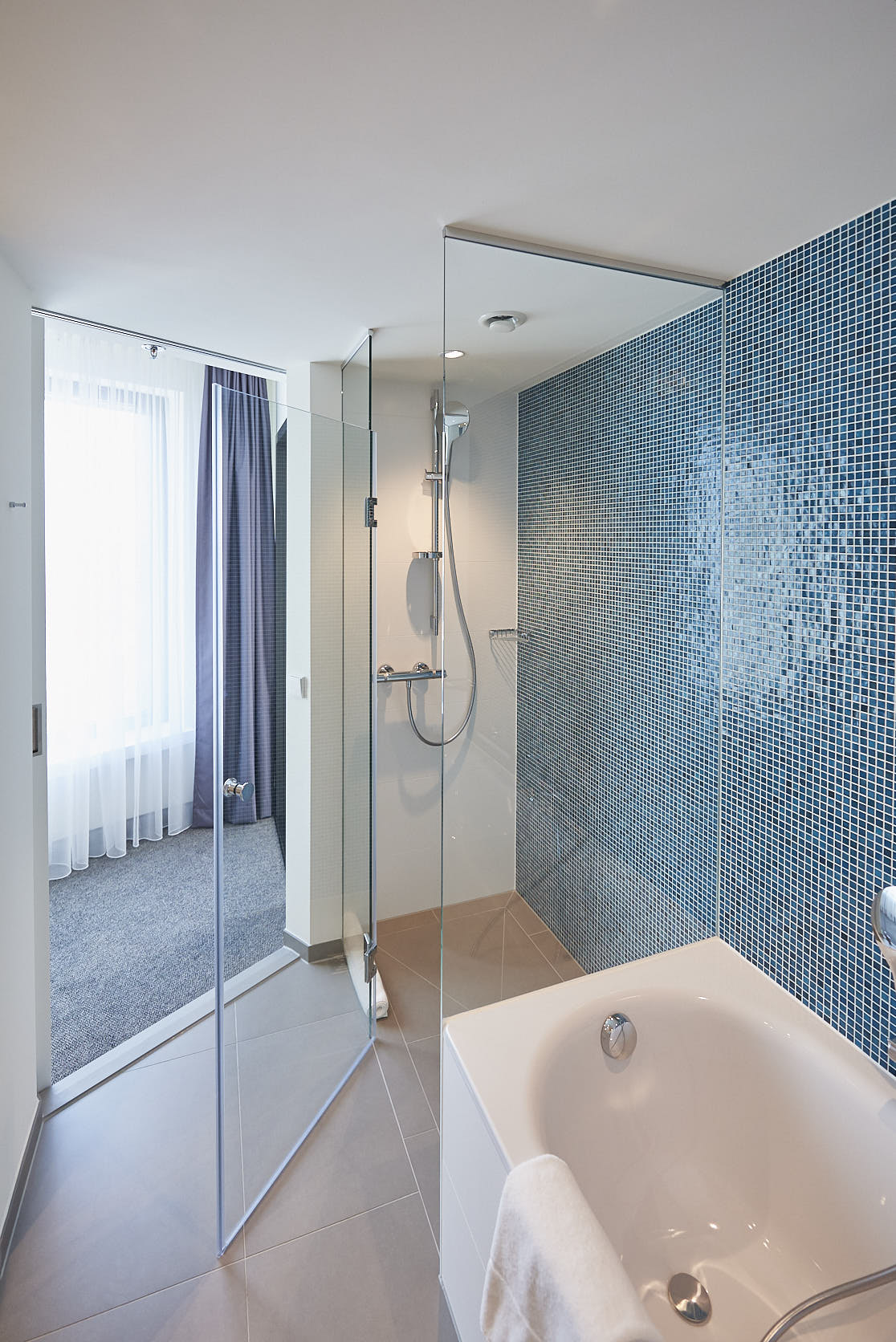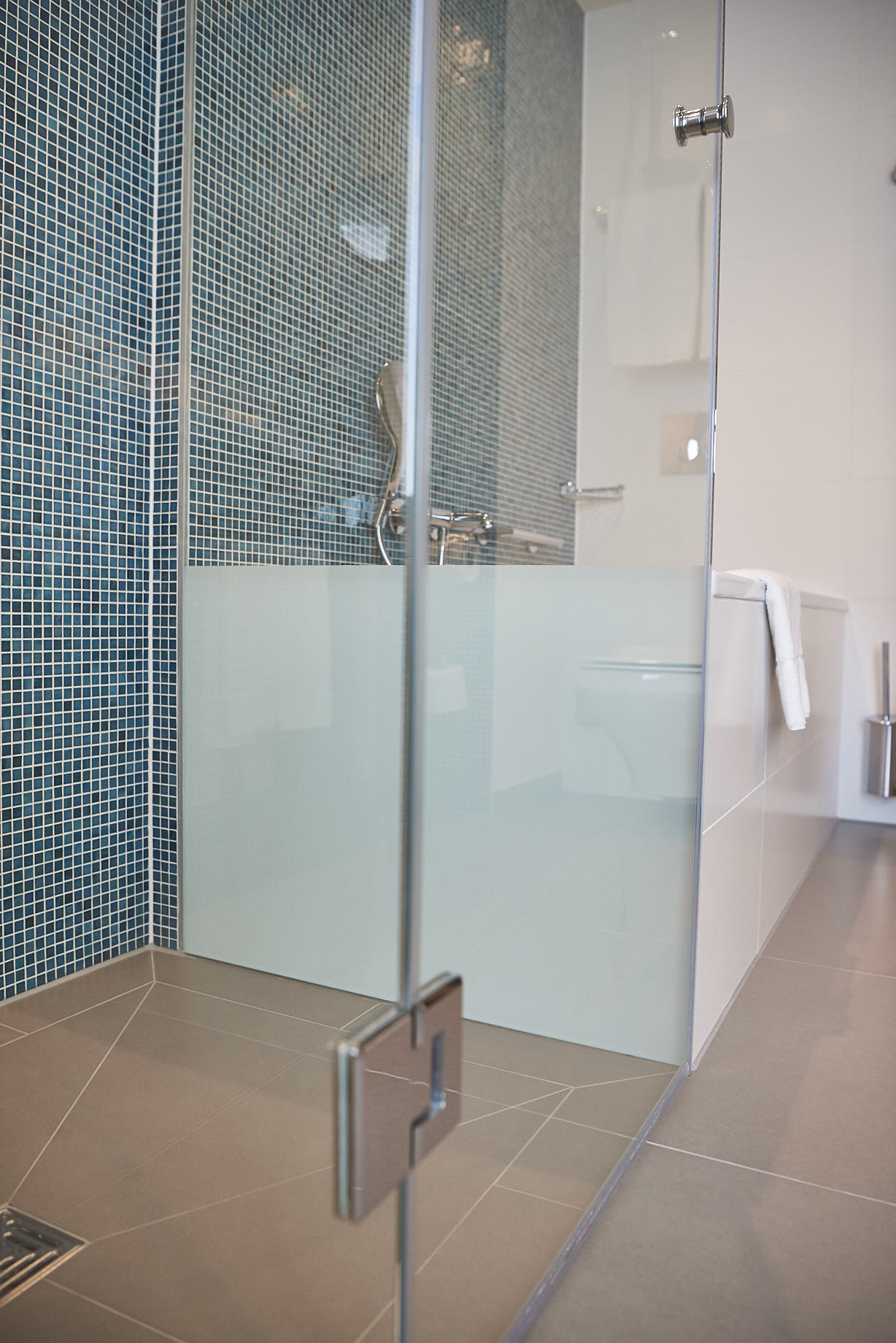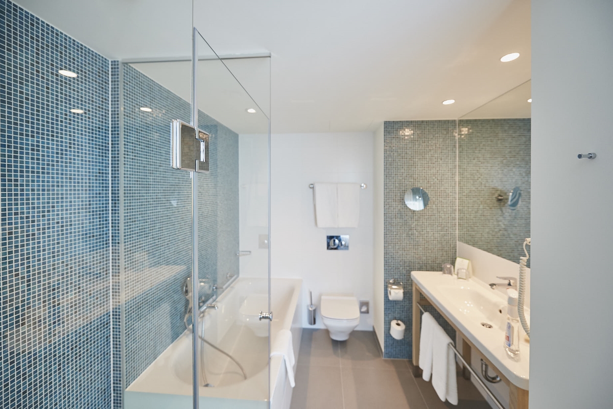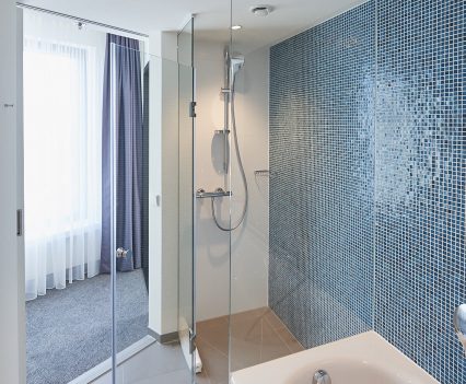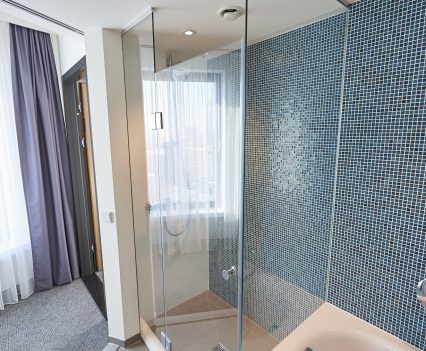 Dzięki zastosowaniu prostych, nowoczesnych form oraz subtelnych szklanych tafli, łazienki hotelu Holiday Inn są nie tylko optycznie większe, ale jednocześnie bardzo dobrze doświetlone i funkcjonalne. Co więcej, w ich projekcie wykorzystano okucia wykonanie z mosiądzu oraz aluminium, przez co pozostają odporne na działanie korozji.