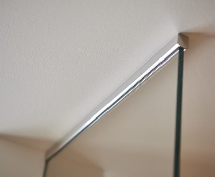 Szkło wykorzystano również w roli przegrody oddzielającej kabinę prysznicową od wanny. Jej montaż możliwy był dzięki niewielkim, aluminiowym profilom Fix Lazio.