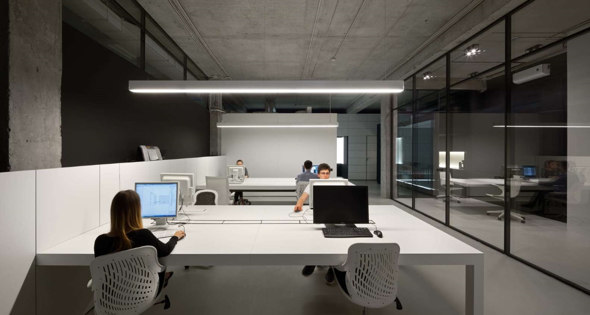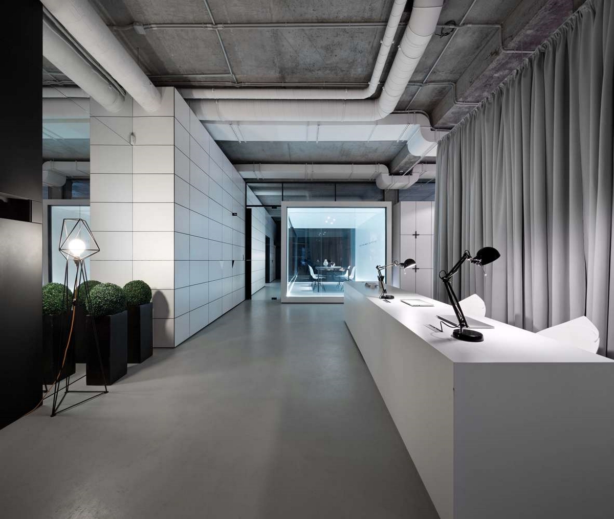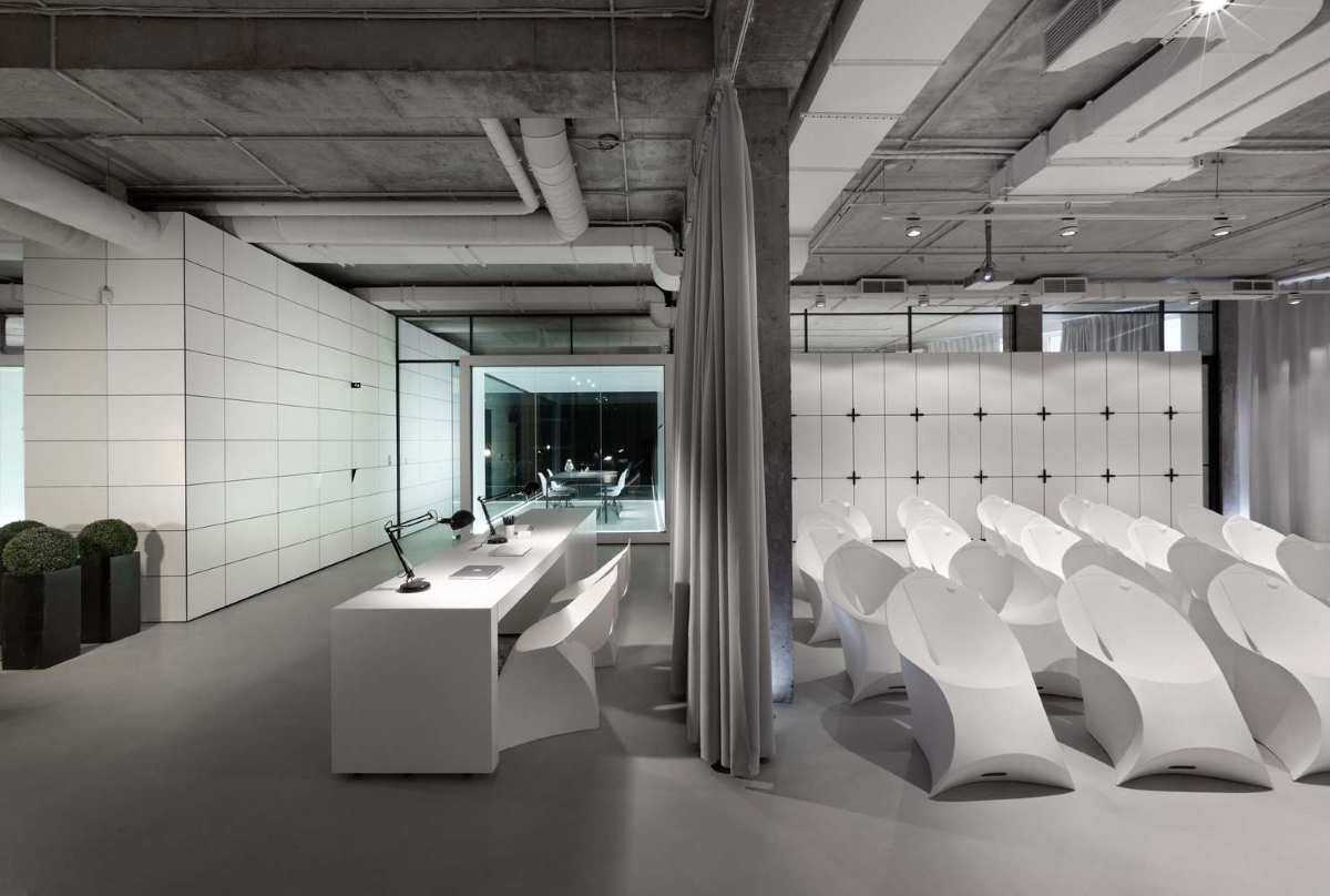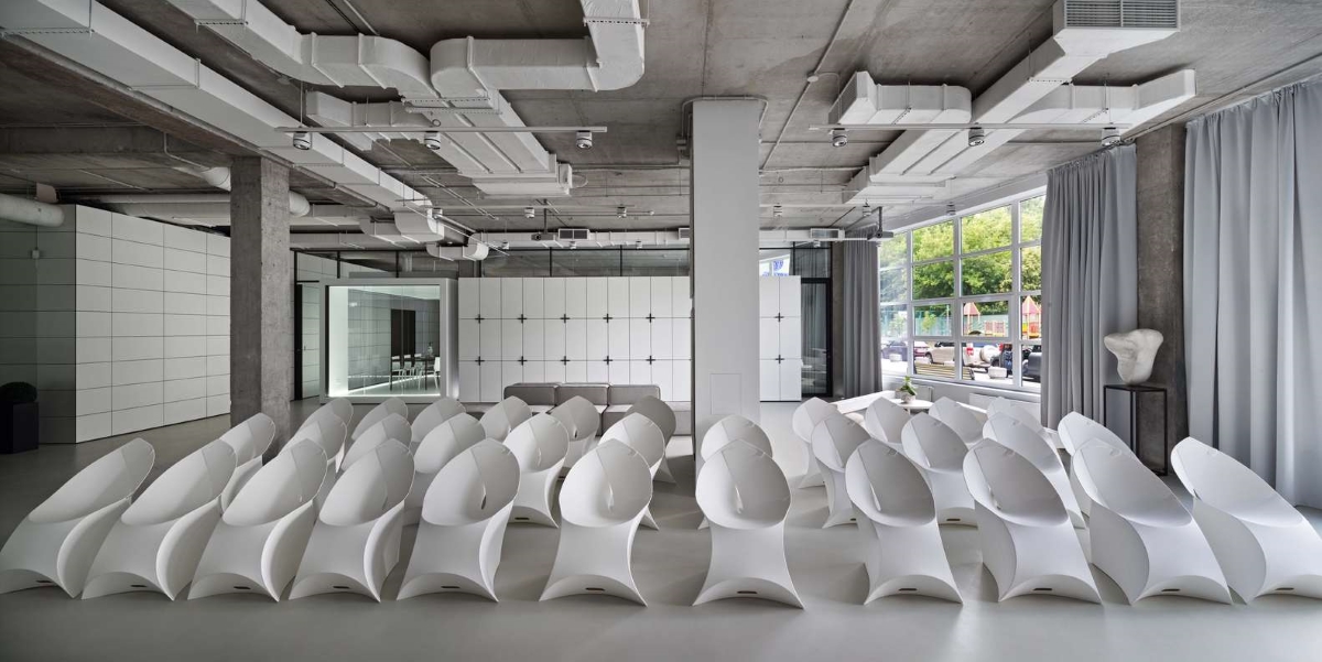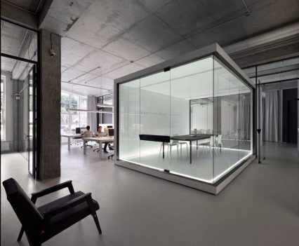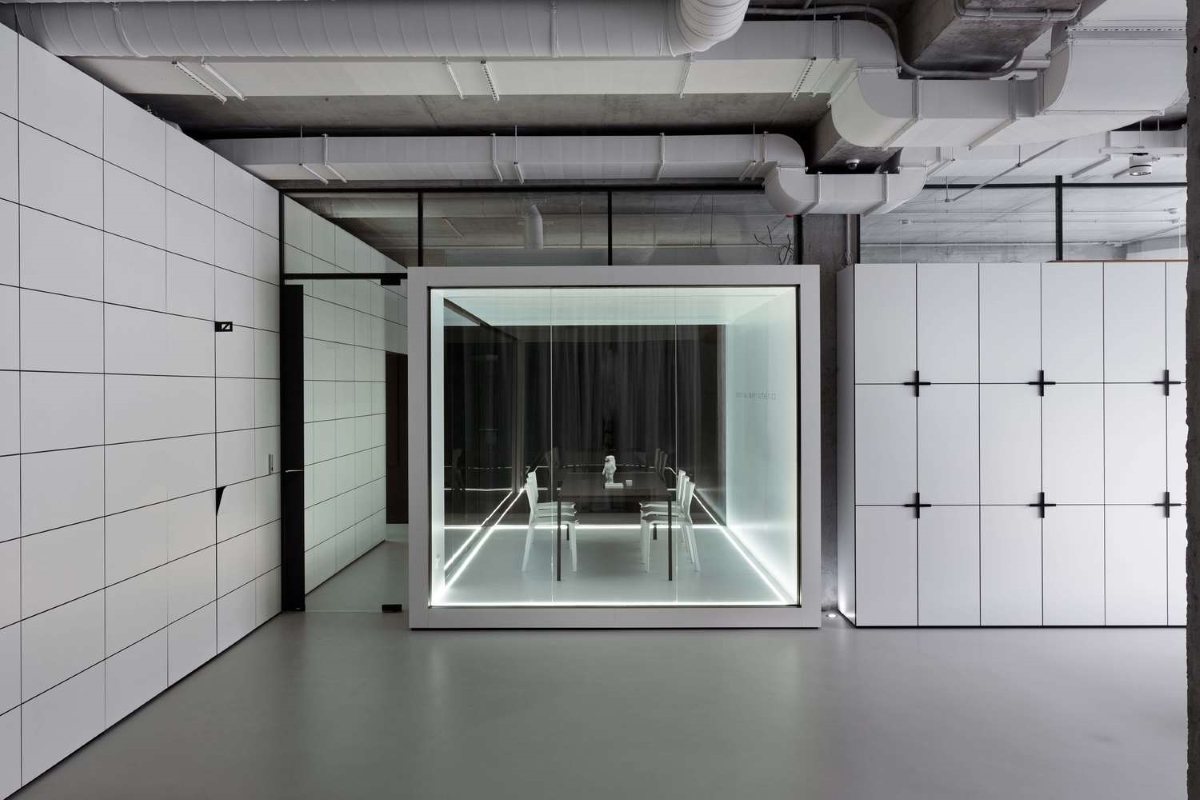 W rezultacie powstała industrialna przestrzeń, zaaranżowana w bardzo minimalistyczny sposób – we wnętrzu dominują czerń oraz biel, a także proste geometryczne formy, które doskonale współgrają z betonowym wykończeniem ścian oraz widoczną instalacją. Styl ten podkreślają liczne szklane konstrukcje, które nie tylko zapewniły lepsze doświetlenie każdego z pomieszczeń, ale podkreśliły również jego nowoczesny charakter. Szkło odgrywa w projekcie Maket Hub szczególną rolę – dodało przestrzeni optycznej lekkości oraz pozwoliło wydzielić strefy funkcyjne bez utraty poczucia przestronności.