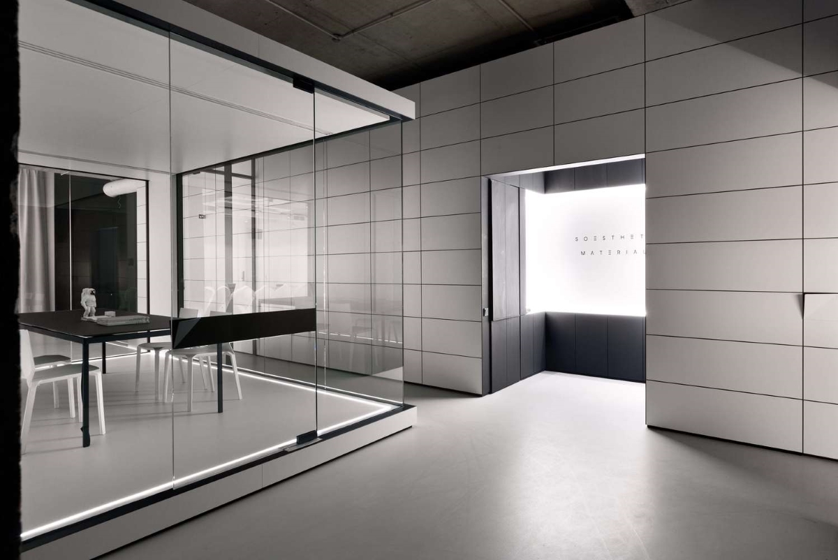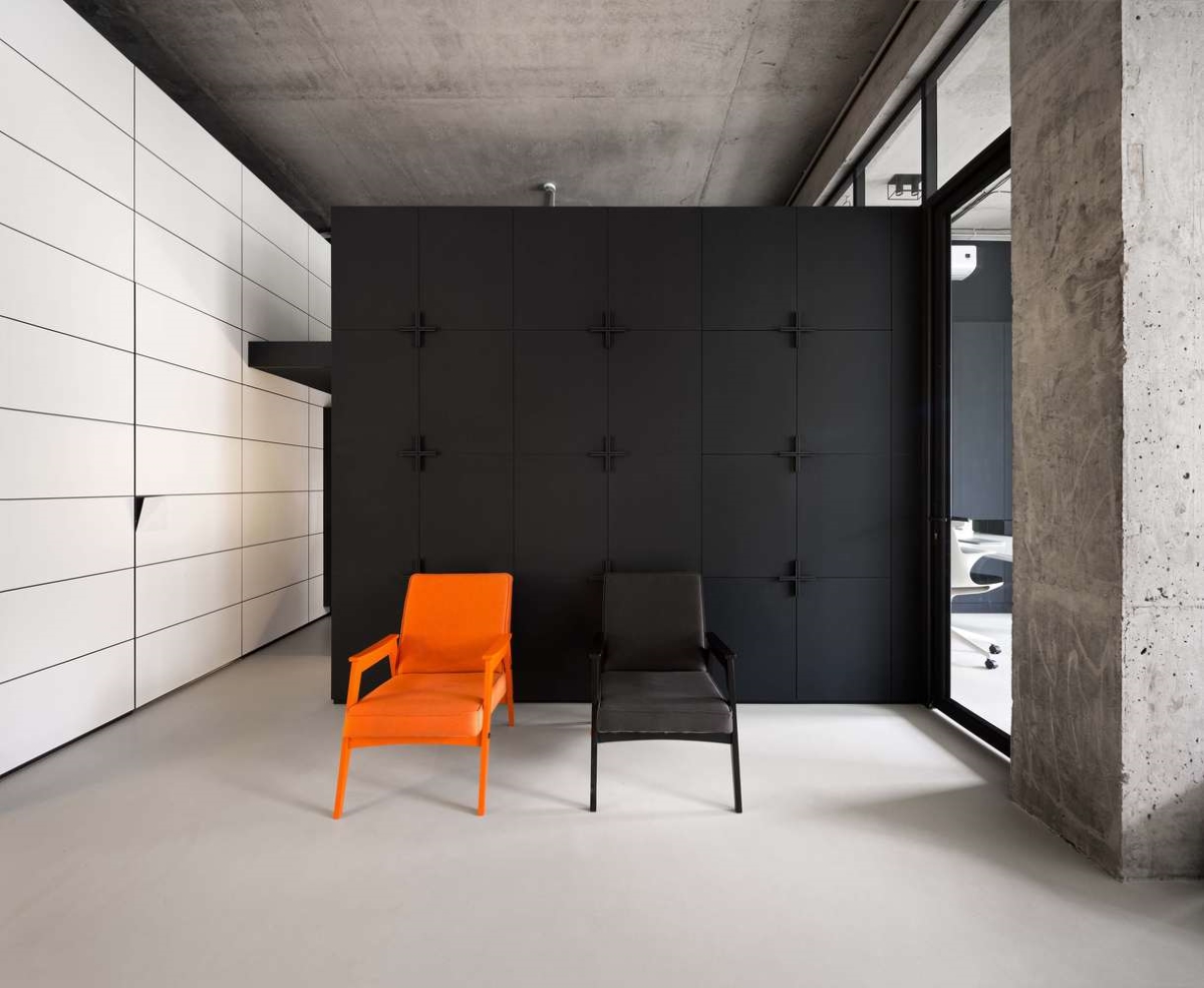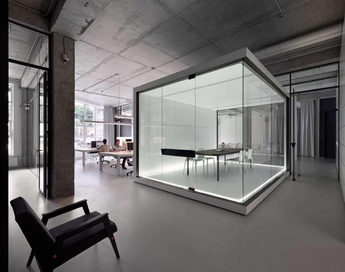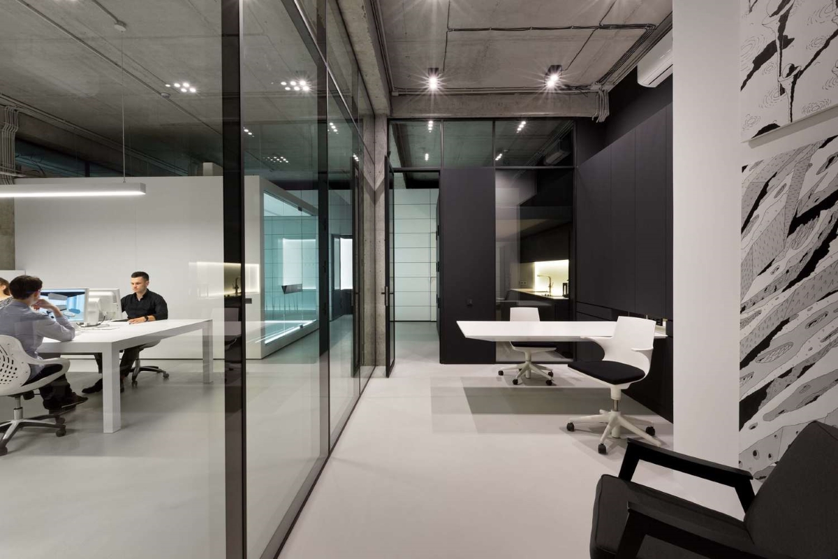 Uwagę przykuwa przede wszystkim przeszklona sala konferencyjna znajdująca się w centralnej części biura. Wykonana została z pomocą eleganckich, niewysokich listew montażowych oraz subtelnych zawiasów i klamer, przez co szklane tafle pozostały w pełni wyeksponowane. Ze szkła wykonano również naświetla, ścianki oddzielające osobne gabinety oraz drzwi prowadzące do wybranych stref biura. Do montażu wszystkich przeszkleń wykorzystano mocowania w czarnym kolorze, dzięki czemu doskonale wkomponowały się one w aranżację, podkreślając jej modernistyczny charakter.