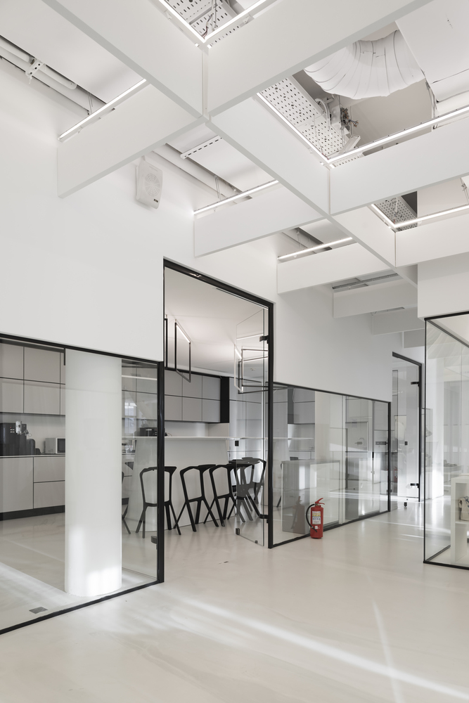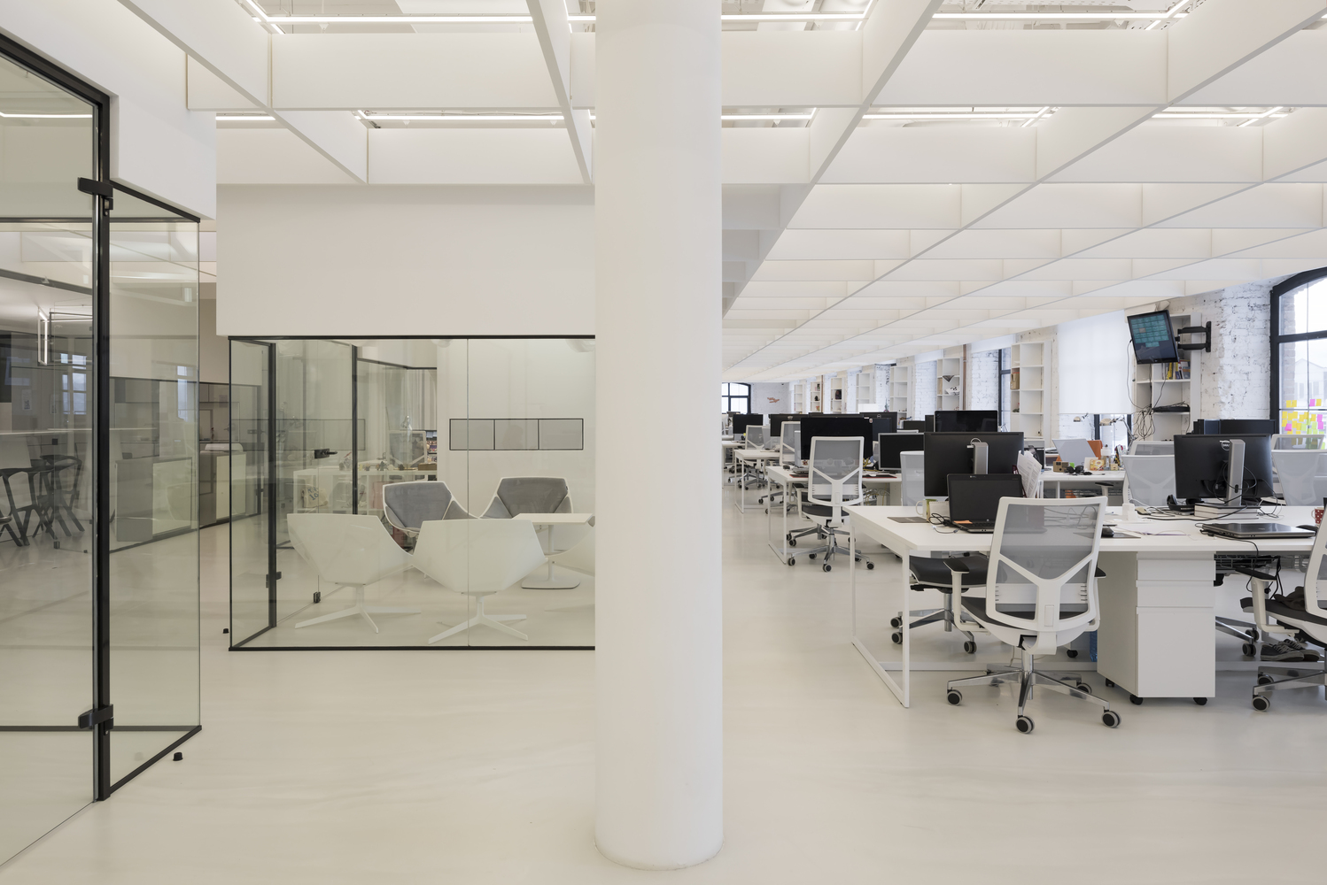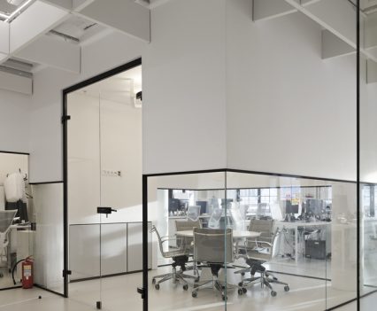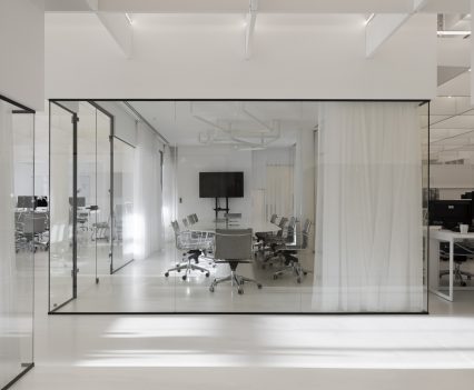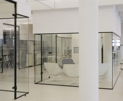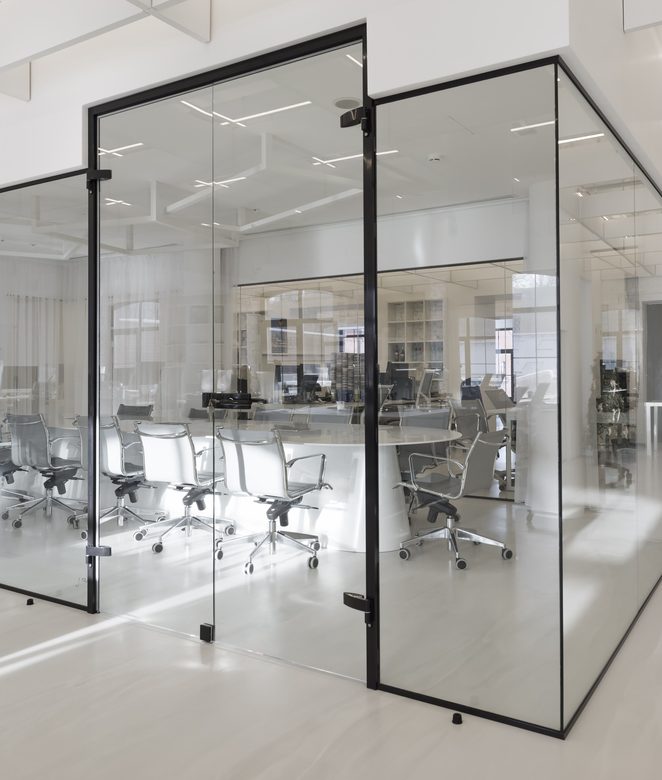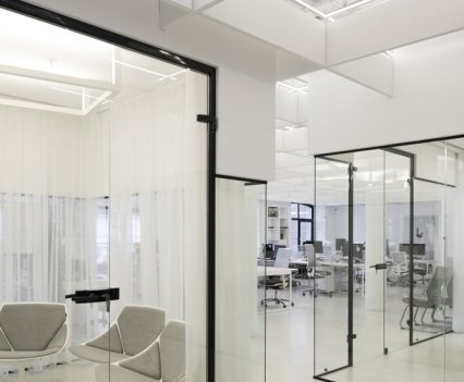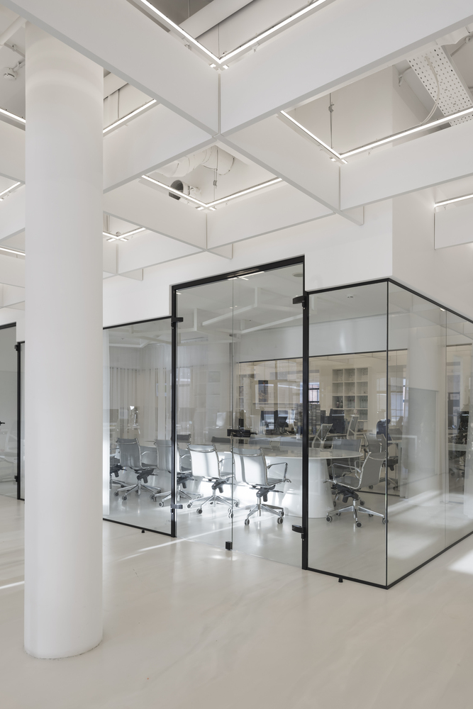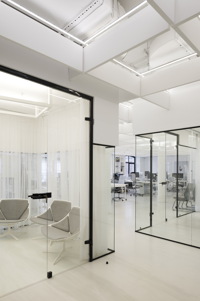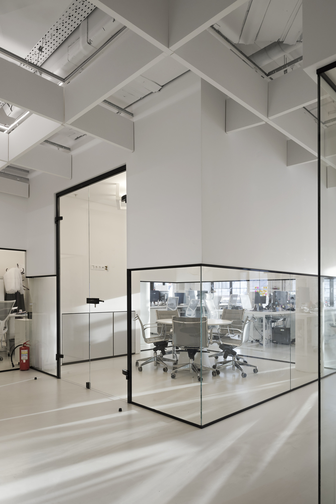 Zastosowanie szkła w aranżacji wnętrza pozwoliło na wydzielenie wielu stanowisk pracy, bez utraty przestronności oraz optycznej lekkości. Zachowany został także surowy, minimalistyczny styl wnętrza, zaś wykorzystane w projekcie kolory, w tym głównie szary, czarny oraz biel, nadają przestrzeni profesjonalnego, eleganckiego charakteru.