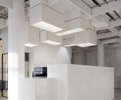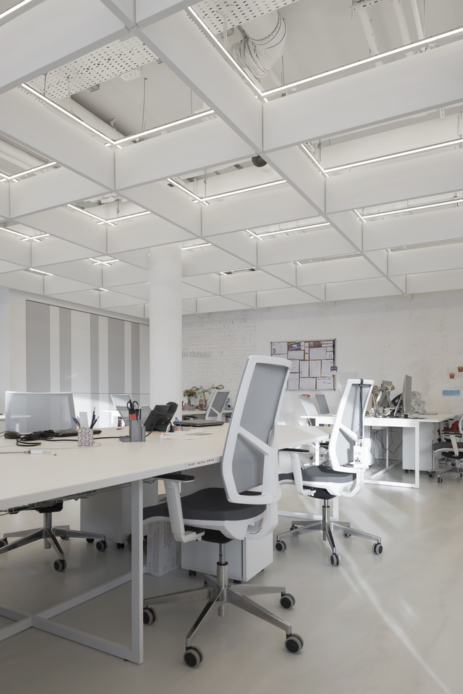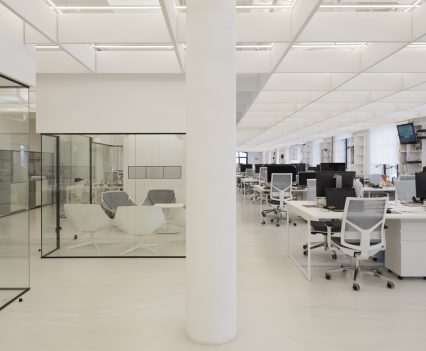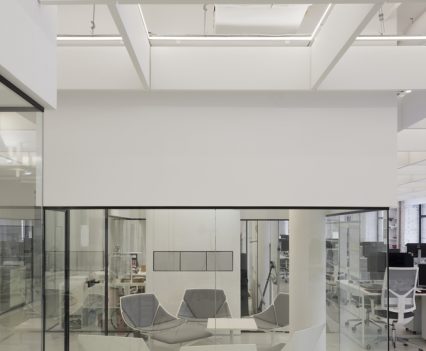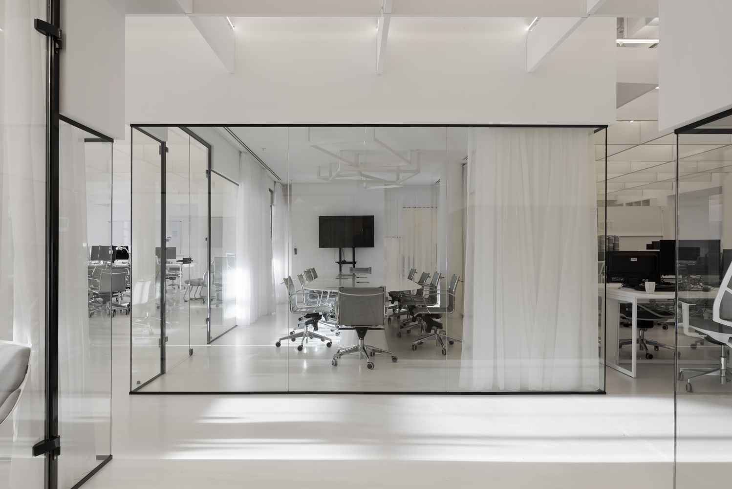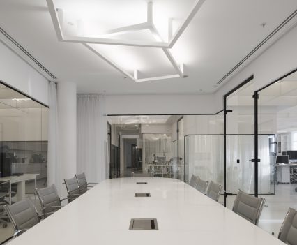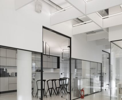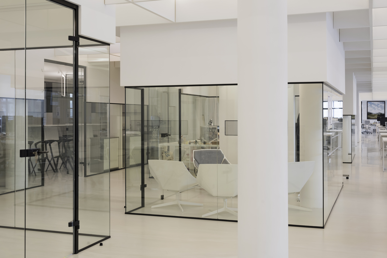 Zastosowanie szkła w aranżacji wnętrza pozwoliło na wydzielenie wielu stanowisk pracy, bez utraty przestronności oraz optycznej lekkości. Zachowany został także surowy, minimalistyczny styl wnętrza, zaś wykorzystane w projekcie kolory, w tym głównie szary, czarny oraz biel, nadają przestrzeni profesjonalnego, eleganckiego charakteru.