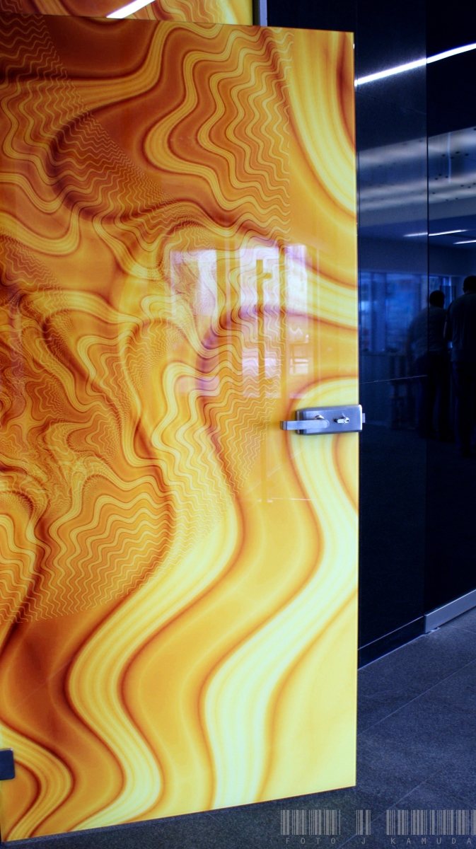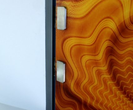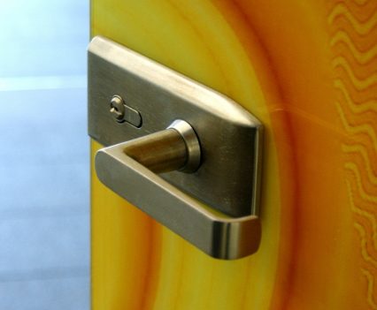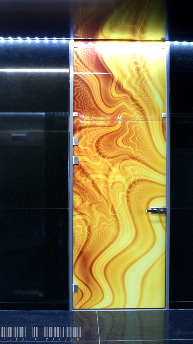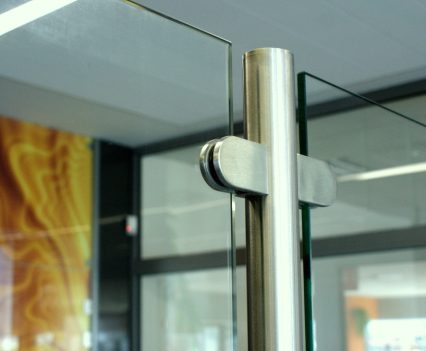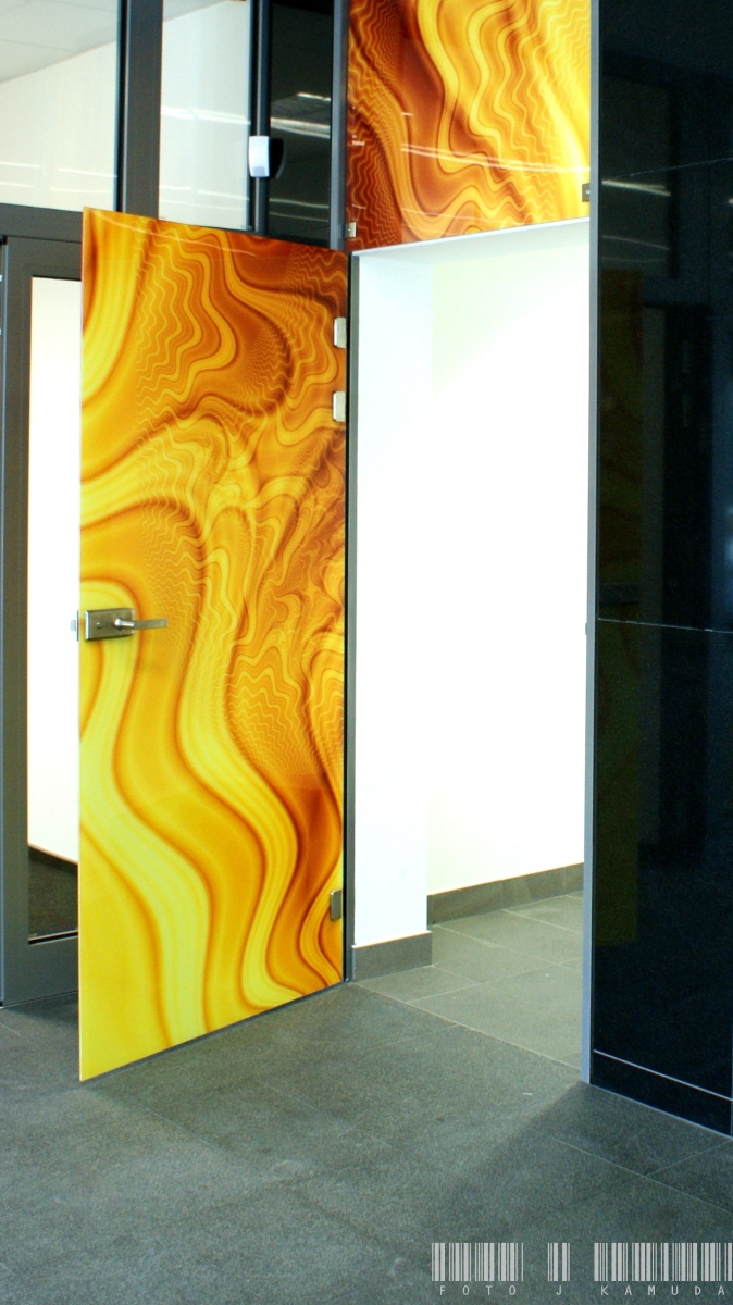 Elementem charakterystycznym, który zdecydowanie urozmaica wnętrze, są kolorowe szklane drzwi z naświetlem górnym. Do ich wykonania wybrano żółto – pomarańczowe tafle w nieregularne wzory, dzięki czemu odróżniają się one od ciemnych naświetli bocznych. Wszystkie zamocowane zostały z pomocą odpowiednich profili, na zawiasach z serii Erice Line. Z tej samej kolekcji dobrane zostały także zamki oraz klamki. Ze względu na rozmiar drzwi, w ich górnej części zastosowano dodatkowy, trzeci zawias. Z kolei na montaż górnego naświetla pozwoliły specjalne klamry.