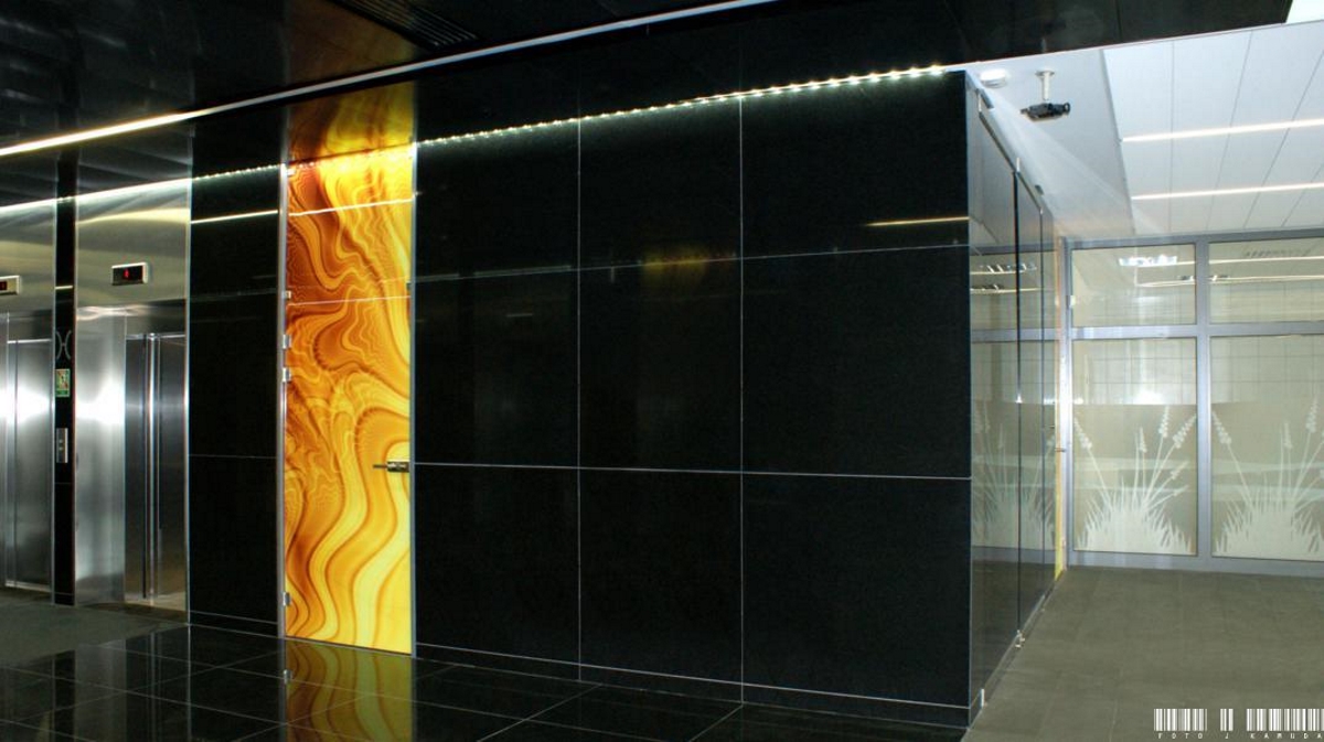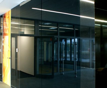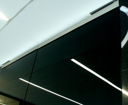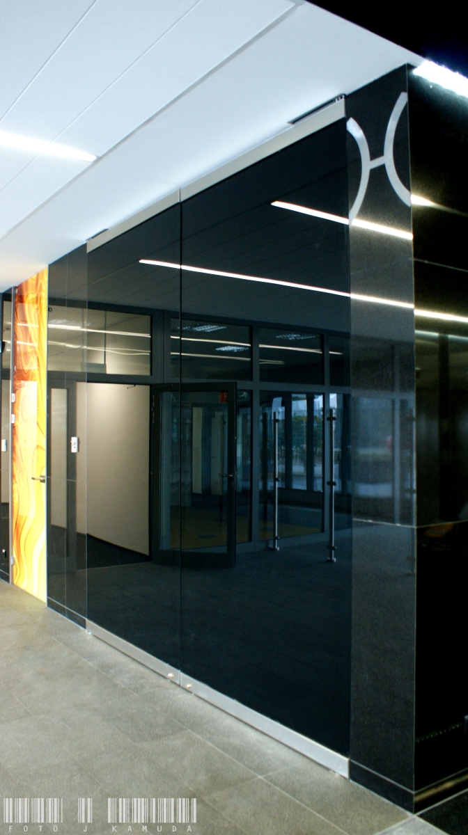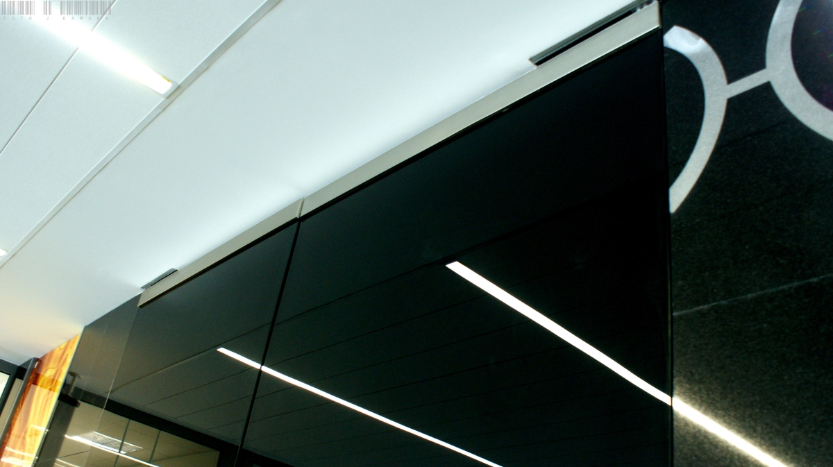 W projekcie postawiono na efektowne czarne tafle, które pozwoliły na oddzielenie zaplecza technicznego od reszty biura. Do ich montażu wykorzystano listwy z serii DRM Roma. Zastosowanie specjalnych zawiasów na górze formatki oraz samozamykaczy Bergamo na dole umożliwiło swobodne otwarcie tafli, na wzór dwuskrzydłowych drzwi.
